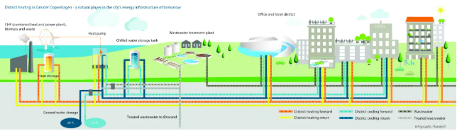 丹麥哥本哈根地區(qū)的Taarnby市將區(qū)域供冷和區(qū)域供熱的生產(chǎn)與地源供冷和冷水儲存集合在一個設(shè)施中,該設(shè)施同時利用了附近污水處理廠的余熱。這種共生模式使得公用事業(yè)公司可以為該地區(qū)的建筑業(yè)主提供具有競爭力且更環(huán)保的制冷,同時為區(qū)域供熱網(wǎng)絡(luò)提供更具成本效益的供熱。