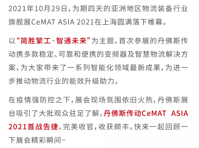 在疫情強(qiáng)防控下,展會現(xiàn)場氛圍依舊火熱,丹佛斯展臺吸引了大批觀眾駐足了解。丹佛斯傳動CeMAT ASIA 2021首戰(zhàn)告捷,完美收官,收獲頗豐??靵硪黄鸹仡櫼幌抡箷仕查g~